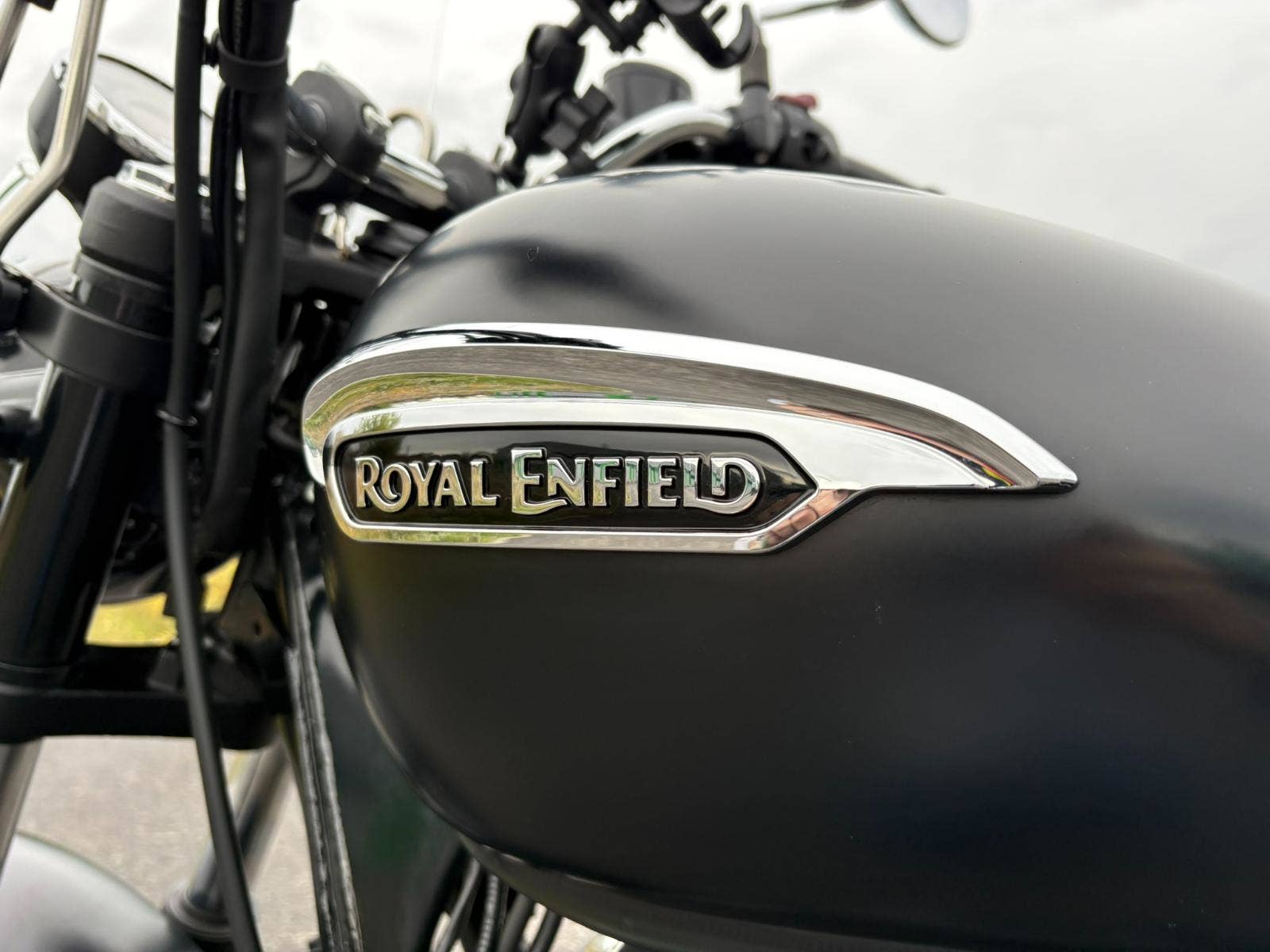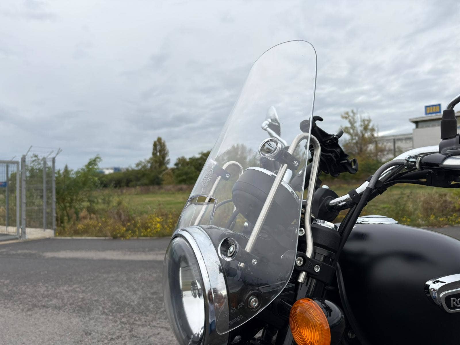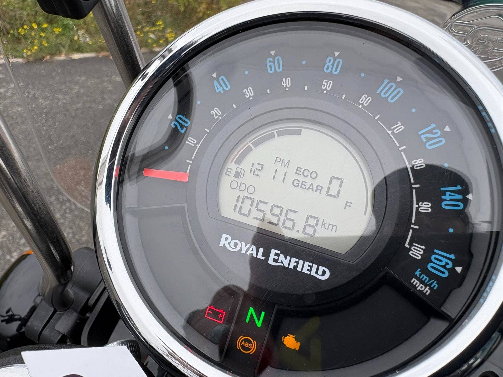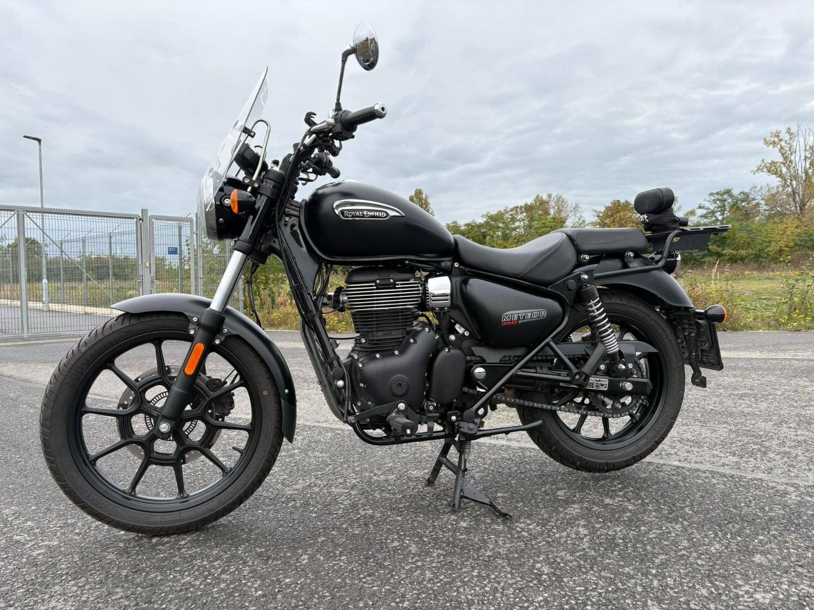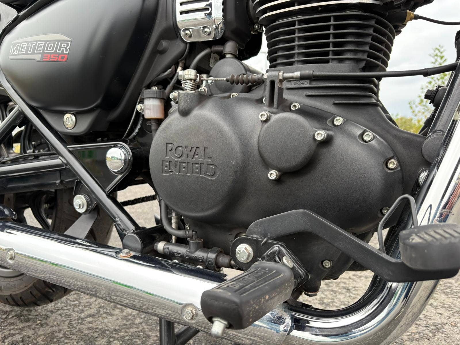 Pěkný Royal Enfield Meteor 350 v barvě Stellar matt black s nájezdem 10597 km od prvního majitele. Vždy řádně servisován (tři garanční servisy), servisní knížka a dva klíče. Motocykl je dovybaven originálním plexi štítem, doplňkovým nosičem zavazedel a doplňkovou opěrkou spolujezdce. Originální opěrka spolujezdce je přibalena k motocyklu. Telefon můžete umístit do přídavného držáku na řídítkách a díky tomu se cestou neztratíte.